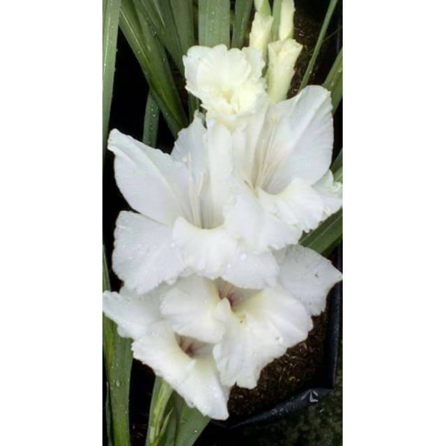 Gladiol berwarna putih bengan bunga yang tumu disepanjang tangkai sangat cantik dan elegan bisa dijadikan bunga potong. Tentang Bunga Gladiol Gladiol merupakan tanaman hias bunga semusim yang banyak digemari karena kesegarannya bisa bertahan lama rata-rata 5-10 hari lamanya. Gladiol merupakan tanaman bunga hias berupa tanaman semusim berbentuk herba termasuk dalam famili Iridaceae.